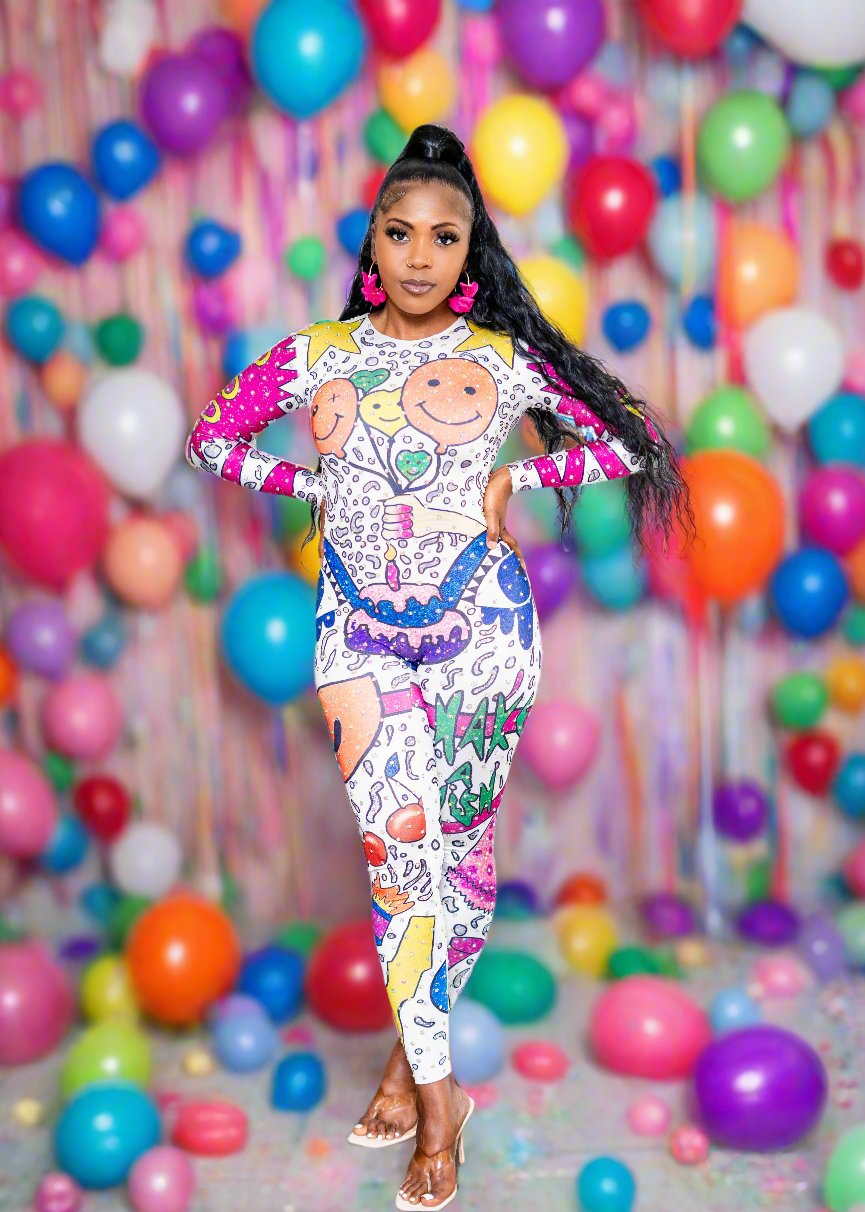 Celebrate your special day in style with the It's My Birthday Jumpsuit! Made for the birthday girl. Stand out from the crowd with its vibrant colors and sparkling rhinestones. Make a statement and feel fabulous on your birthday! Perfect for a fun and unique birthday look. (Birthday hat and cake not included.)